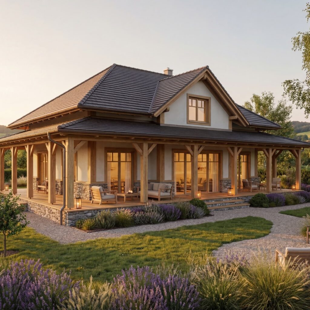 Der Eichenhof 145 vereint das Beste aus zwei Welten: die Gelassenheit eines bayerischen Landhauses und die Klarheit moderner Architektur. Das charakteristische Zeltdach mit Mittelgiebel verleiht dem Haus seine ausgewogene Form, während Eichenholz und heller Putz eine warme, natürliche Ausstrahlung schaffen.